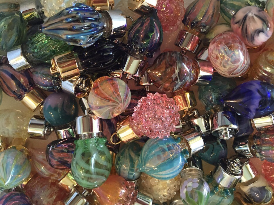 Here is a close up of the hand blown Tinkerbells Gems Bottles to hold your essential oil. With chrome or gold lids over brass with orifice reducer. These are on special 10$ off each one.