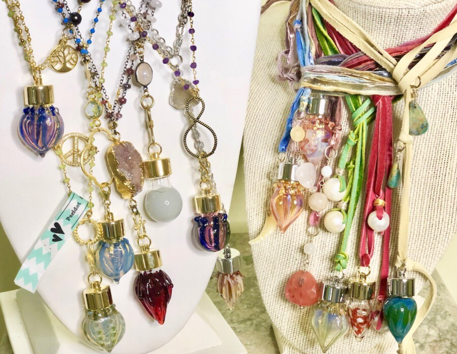 All materials hold high frequencies. Findings in sterling or vermeil. Gem bottles on chains in gold or sterling over sterling or copper on left. Lariots on cords with gems on sterling on the right.