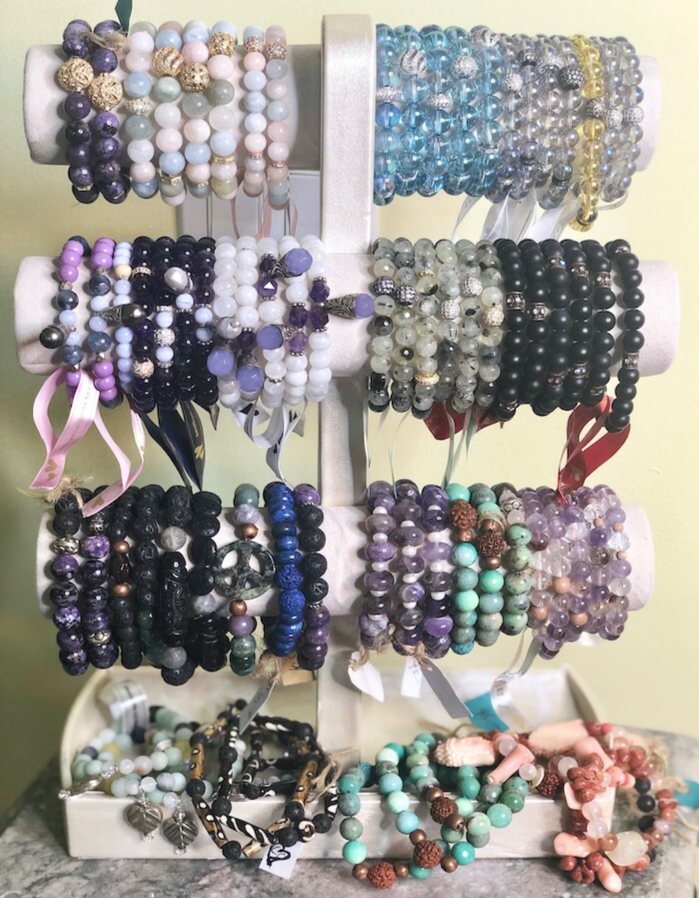 I take gems and wash them with the intention that they are cleansed and hold the highest benefit for the person who wears it. I then place them in the sunlight to charge them. I then finish by diffusing Young Living Essential Oils over them usually Harmony and Joy! When I have finished creating each piece, I receive its name, or oil that resonates.