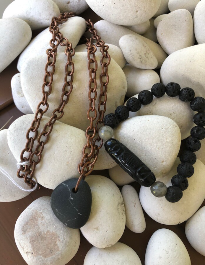 Earthing Tools line: This is an example of a river rock on a copper chain, shown with a lava bracelet featuring carved black jade and labrodorite.